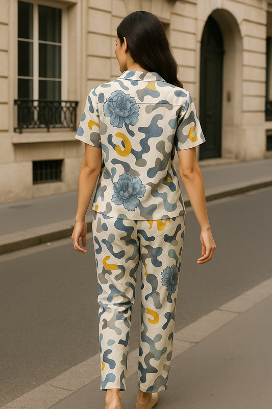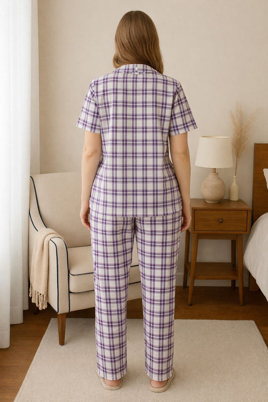Women’s Check Cotton Pajama Set – Short Sleeve Button-Down Top & Full Length Pants